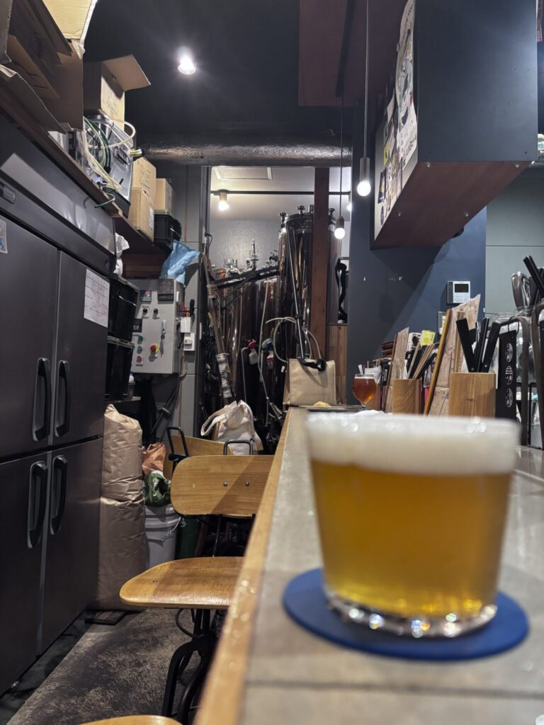特筆すべきは、お店の奥に見えるコンパクトながら使い込まれた醸造施設です。目の前でビールが生まれていると思うと、気分が高まりますね!ビール愛に溢れた空間に、一人でもふらりと立ち寄りやすい空気感があります。